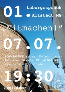 Am 07.07. lädt die Stadt MG zum 1. Laborgespräch zur Revitalisierung der Altstadt ins SONNENDECK (ehem. Kolpinghaus) ein. Damit sind wir endlich an dem Punkt, dass die weiteren Entwicklungsschritte mit allen interessierten Altstädtern gemeinsam erarbeitet werden. Wir streben an, fortan in einem kontinuierlichen Prozess „gemeinsam Stadt zu machen“, dabei konkrete Lösungen für bestimmte Problematiken zu finden, Verbesserungsvorschläge zu diskutieren und diese mit Unterstützung der Stadt umzusetzen. Diesen offenen Prozess hat die initiative altstadt als Sprachrohr der Altstädter mit auf den Weg gebracht.